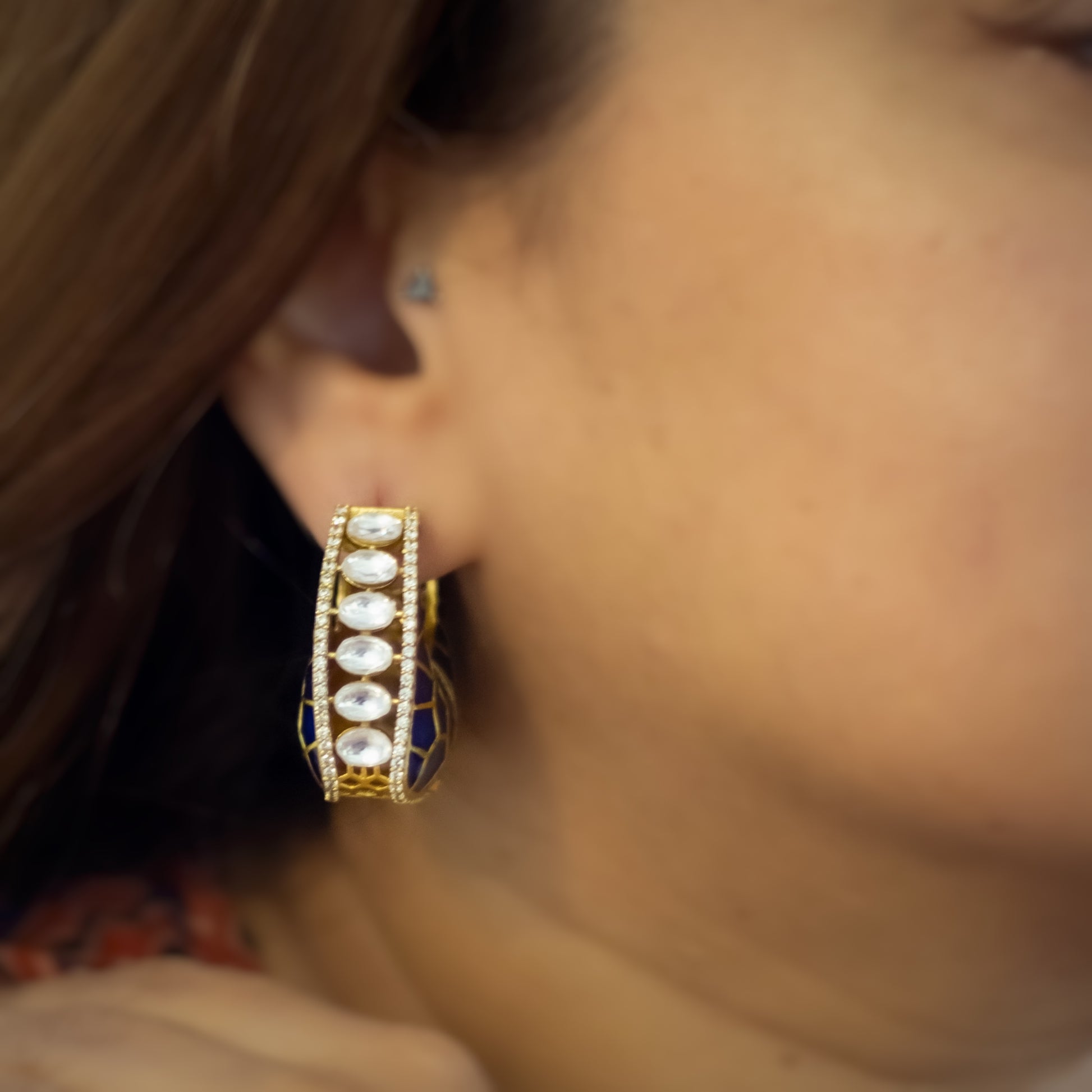 Make a regal statement with our Blue Maharani Earrings, crafted to add a touch of royalty to your look. These exquisite earrings feature a rich blue hue adorned with sparkling faux gemstones, exuding timeless elegance and charm.