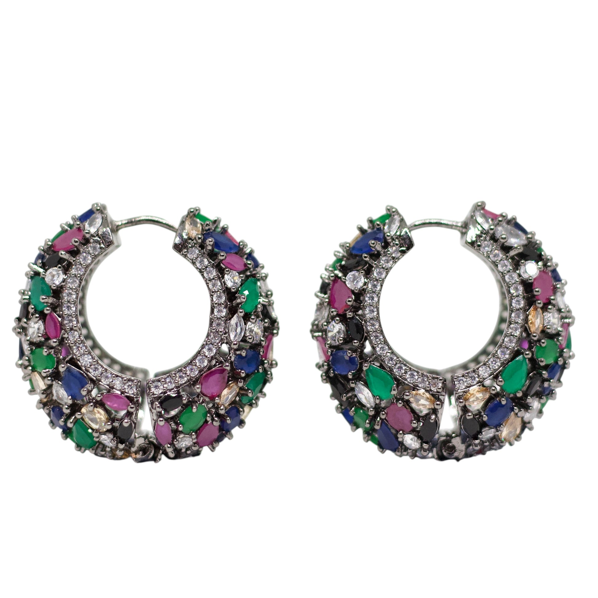 Step into a world of heritage and elegance with our Navratan Royale Hoops, inspired by the timeless beauty of traditional Indian jewels. Adorned with nine vibrant faux gemstones symbolizing prosperity and grace, these hoops are a perfect fusion of color, culture, and contemporary design.