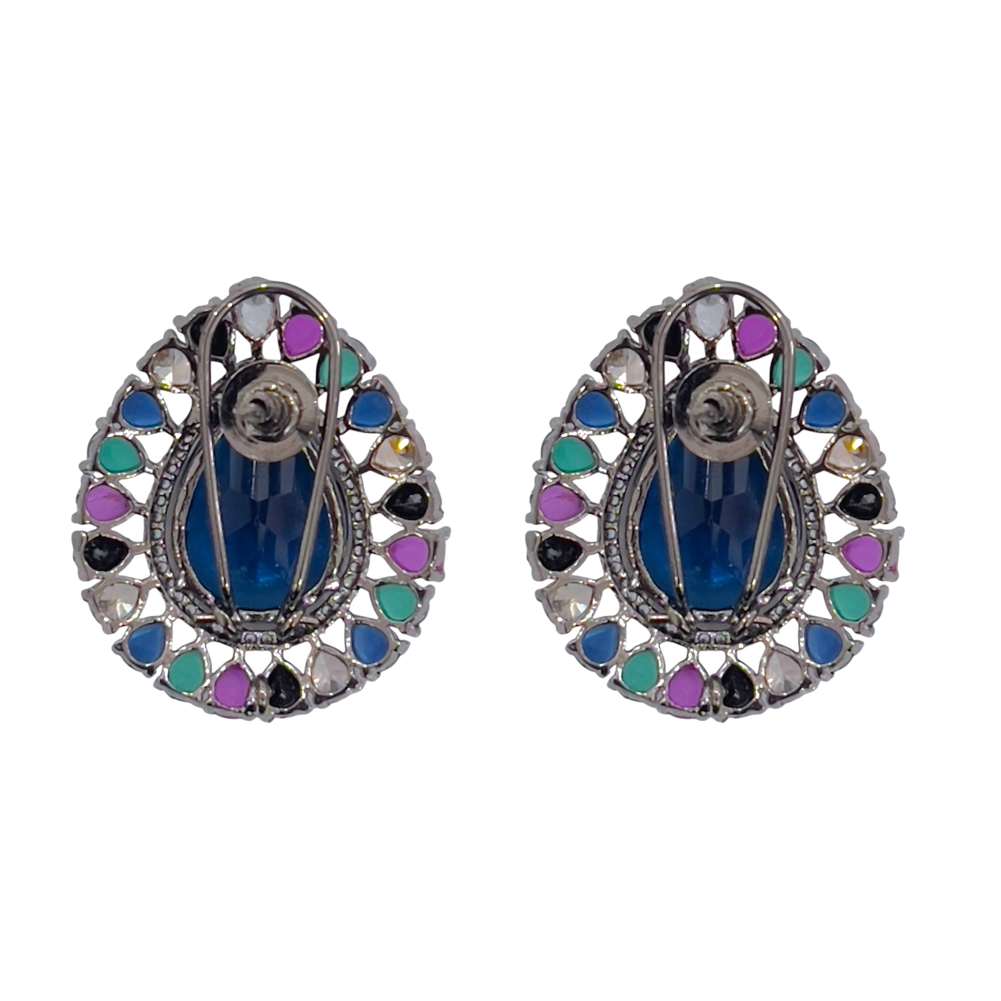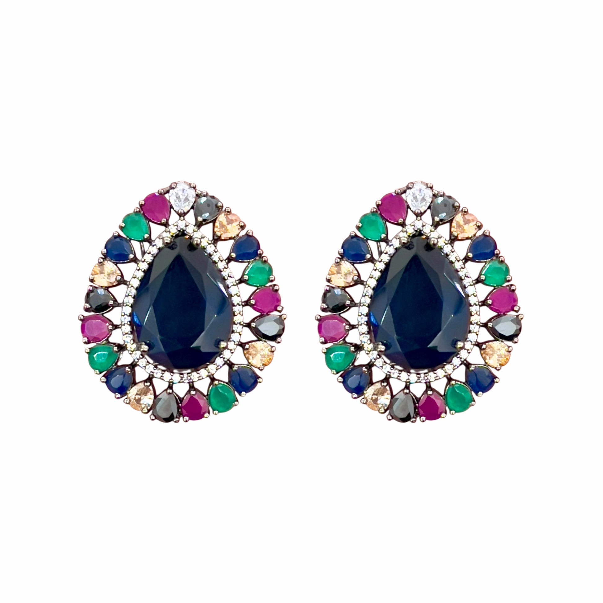 Add a royal touch to your look with our Peacock Crown Studs, inspired by the majestic hues of a peacock’s plume. Designed with a rich teardrop motif at the center, these earrings feature a striking deep blue stone surrounded by vibrant accents of emerald green, royal blue, magenta, and sparkling crystals.